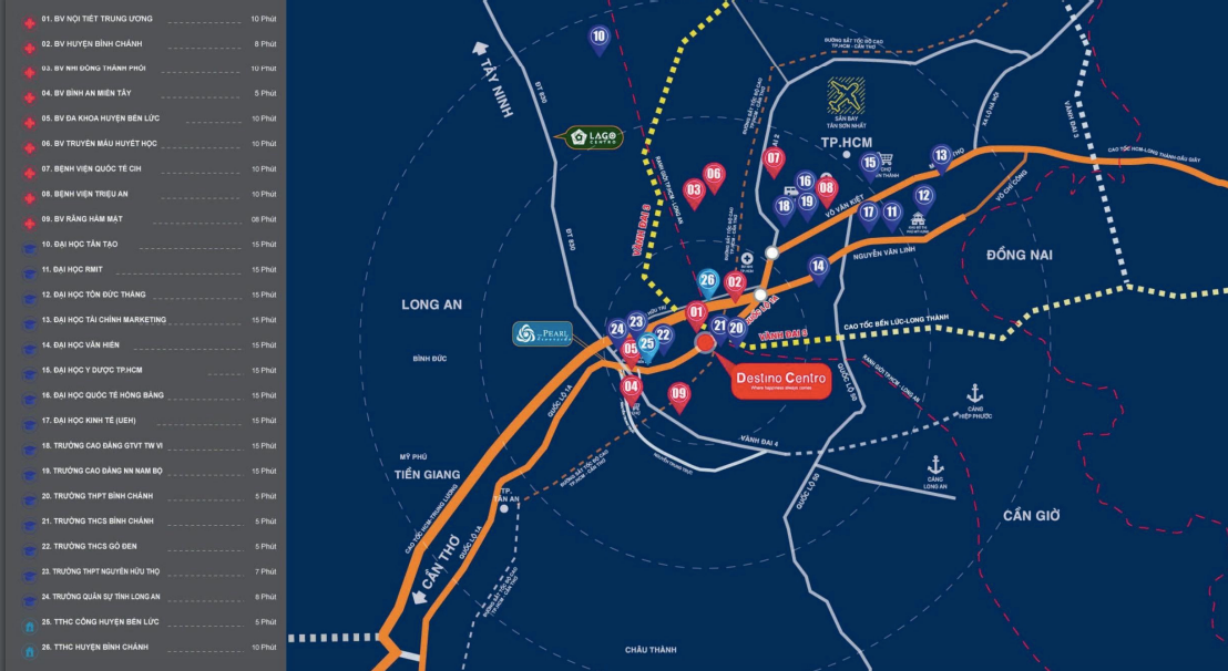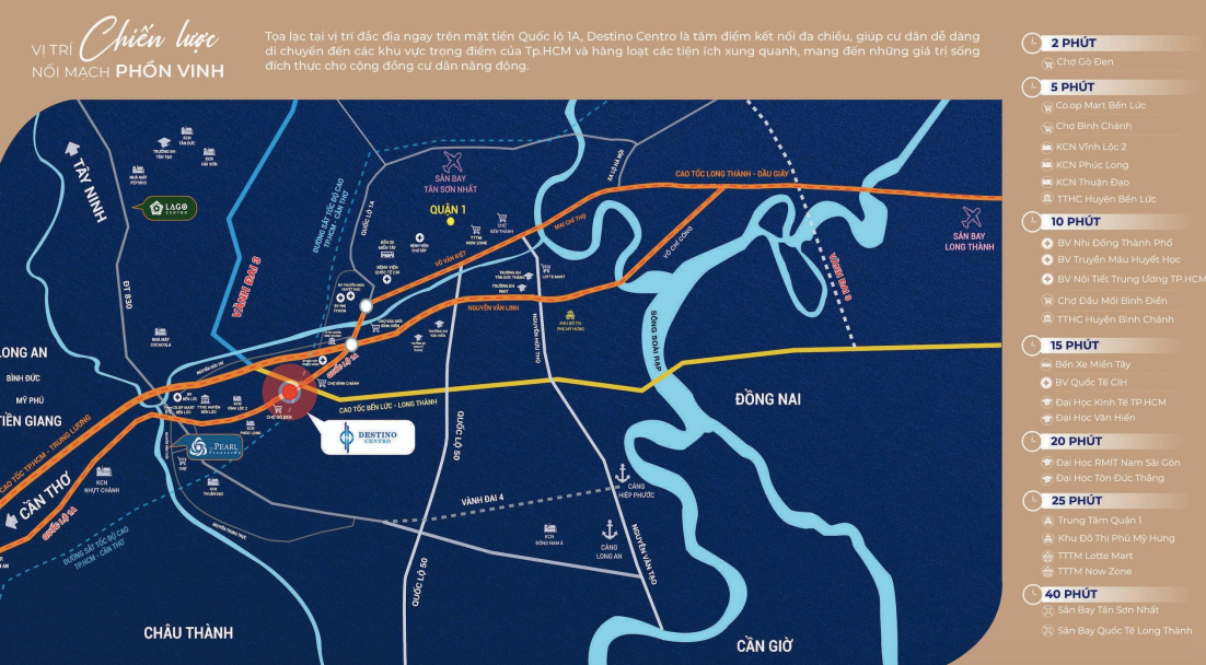 Tọa lạc tại vị trí đắc địa ngay Quốc Lộ 1A, Destino Centro là tâm điểm kết nối đa chiều, giúp cư dân dễ dàng di chuyển đến các khu vực trọng điểm của TpHCM và hàng loạt các tiện ích xung quanh, mang đến những giá trị sống đích thực cho cộng đồng cư dân năng động