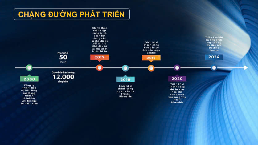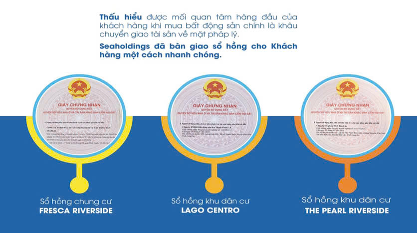 Seaholdings với hơn 16 năm kinh nghiệm trong lĩnh vực đầu tư và phát triển bất động sản. Phát triển thành công 3 dự án: căn hộ Fresca Riverside, khu dân cư Lago Centro và khu nhà phố biệt thự compound ven sông cao cấp The Pearl Riverside. Đặc biệt, tất cả đều đã bàn giao và giấy chứng nhận đúng cam kết hợp đồng với khách hàng.